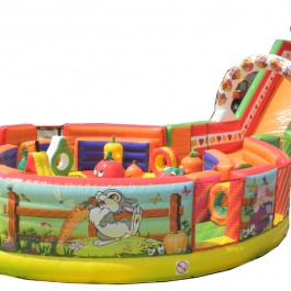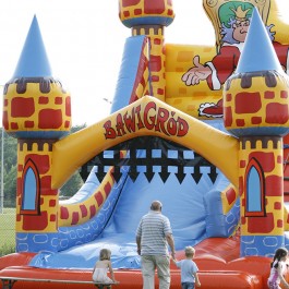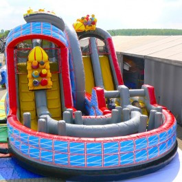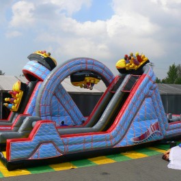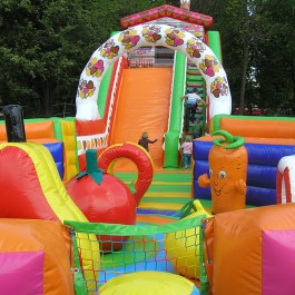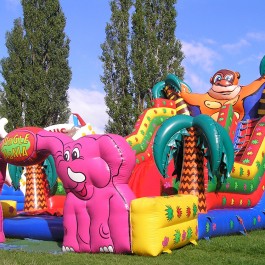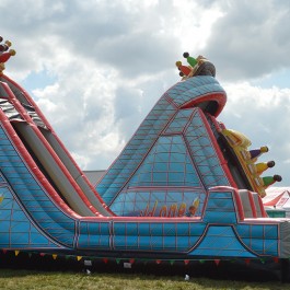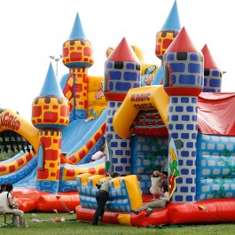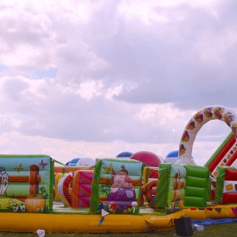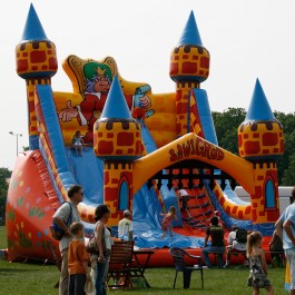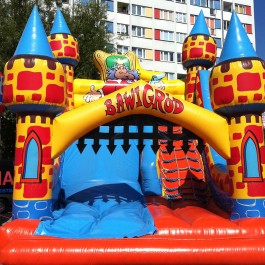 Zjeżdżalnia bawigród: średnia – idealnie komponuje się jako zestaw z zamkiem do skakania „magic castle”. Wymiary: długość: 8.5m; szerokość: 7m; wysokość: 7,5m. Pobór mocy: 1,1KW