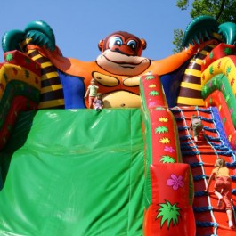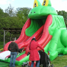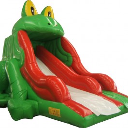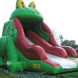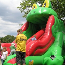 Zjeżdżalnia żabka – mała z długim ślizgiem – idealna dla najmłodszych milusińskich. Wymiary: zjeżdżalnia – długość: 7m; szerokość: 4m; wysokość: 5,5m. Pobór mocy: 1,1KW